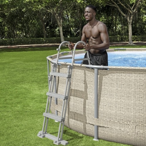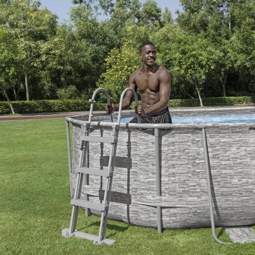A létra kerek és téglalap alakú, felfújható és állványos medencékhez is alkalmas, 107 cm magas falmagasságig.