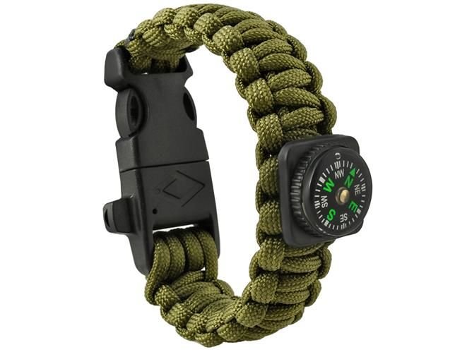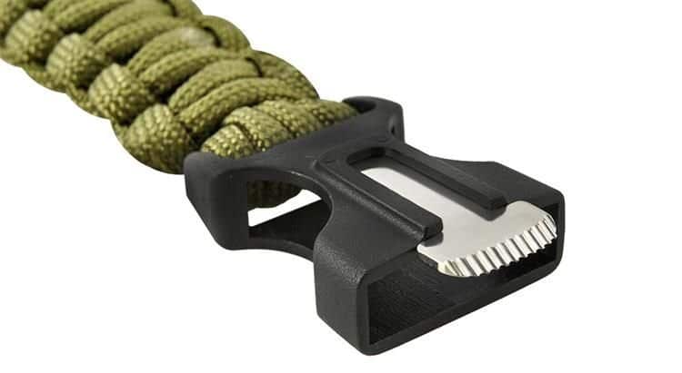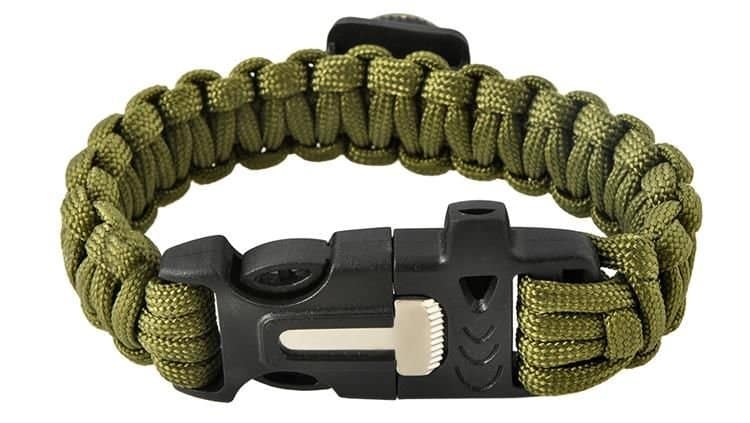 Egy kis méretű kést rejtettek a záróelembe, amely többféle anyagot is képes elvágni. A karkötőbe integrált magnéziumrúddal szikrát csiholhat és tüzet gyújthat. A műanyag záróelem oldalán található a síp, amellyel kilátástalan helyzetben felhívhatja magára mások figyelmét. A karkötő előoldalán elhelyezett iránytűben olyan folyadék van, amely tartalmazza magát a tűt, így még pontosabban behatárolhatja aktuális helyzetét.