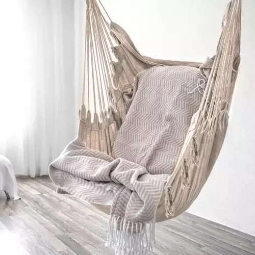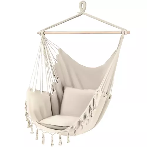 A termék rendkívül komfortos és nagy ülőfelülettel rendelkezik így kényelmesen ellazulhatunk benne akár a teraszon, akár a nappalinkban. Maximális terhelhetősége 150 kg. A hintaszék természetes anyagból készült így jó szellőzést biztosít, ezen kívül a csomag tartalmaz 2 puha párnát, így komfortérzetünk maximális lehet. A fa keresztrúdnak köszönhetően a függőágy nem csuklik össze, mindig mereven tartja magát így akár olvasni is lehet benne, vagy nyugodtan kortyolgathatunk valamilyen italt anélkül hogy kilöttyenne. A természetes anyag biztosítja a megfelelő szellőzést is, ami a meleg napokon is megőrzi a függőszék használatának kényelmét. a függőszéket egy tömör fából készült merevítő rúd tartja, mely vastag kötelekkel van csatlakoztatva a felfüggesztési ponthoz és az ülőfelülethez egyaránt. Ez a kialakítás megkönnyíti a felakasztást , a függőszéknek pedig jól kiegyensúlyozott és stabil tartást biztosít. A háttámla és az ülés naturális, meleg színe dekoratív eleme lesz a kertnek vagy terasznak.