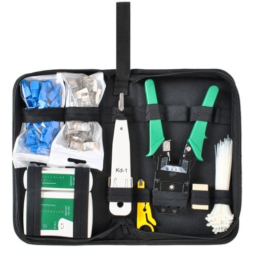 TELJES KÉSZLET – a készlet tartalmaz egy kábeltesztelőt, crimper-t, nyomót, stripper-t, kábelkötözőket, dugókat védőkkel és egy csatlakozót. Az egész segít eltávolítani az összes hibát, és minden hálózat telepítőjének nélkülözhetetlen kelléke.