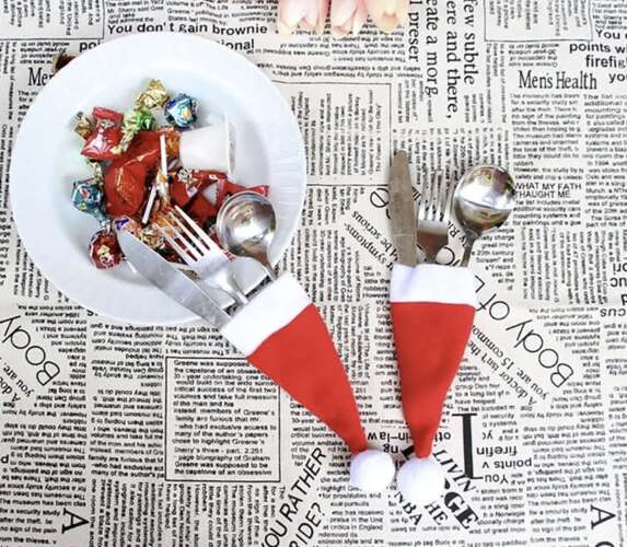 2 AZ 1-BEN – Az evőeszköz sapkák ünnepi hangulatot teremtenek. Ez tökéletes dekoráció egy karácsonyi asztalhoz, ami mindenkit elbűvöl körülötted. Beleteheted az evőeszközöket, de ugyanolyan jól működnek borosüveg dekorációként is.