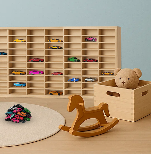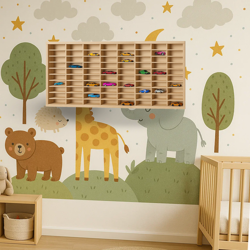 A polc 80 darab, 9,2 × 3,5 cm-es méretű rekeszt tartalmaz, amelyek tökéletesek a legtöbb kisautó számára. Segít rendet tartani, támogatja a gyűjtőszenvedélyt, és egyedi hangulatot ad a gyerekszobának.