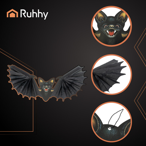 Teremts hátborzongató hangulatot otthonodban, kertedben vagy rendezvényeden a RUHHY élethű függeszthető denevér dekorációval! Az impozáns, 60 cm-es fesztávolságú szárnyakkal rendelkező fekete denevér garantáltan minden tekintetet magára von, legyen szó Halloween buliról, tematikus eseményről, jelmezbálról, fotózásról vagy akár kirakati dekorációról.