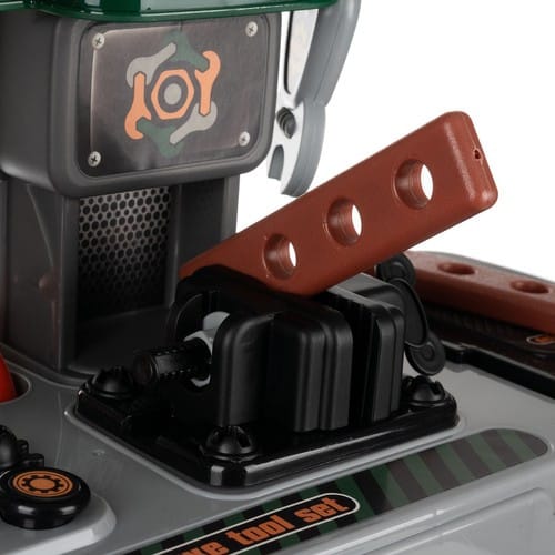 A készlet strapabíró, biztonságos és nem mérgező anyagokból készült, beleértve egy franciakulcsot, kalapácsot, fűrészt, satut, csavarokat és anyákat. Minden eszköz lekerekített élekkel rendelkezik, hogy védje a kis kezeket a sérülésektől.