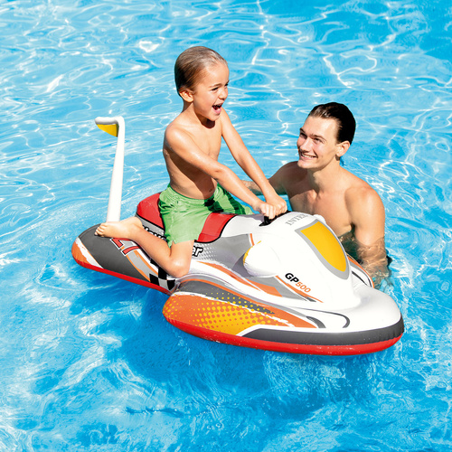 Emeld új szintre a vízi szórakozást az Intex felfújható vízi robogóval gyerekeknek! Ez a stabil és biztonságos kialakítású, színes jet ski formájú úszó matrac órákra biztosít szórakozást a 3 éves és idősebb gyermekek számára. Széles, kiegyensúlyozott formája garantálja, hogy a vízen egyensúlyban maradjon, míg a masszív fogantyú biztonságos fogást nyújt, miközben a gyerekek száguldoznak és fröcskölnek.