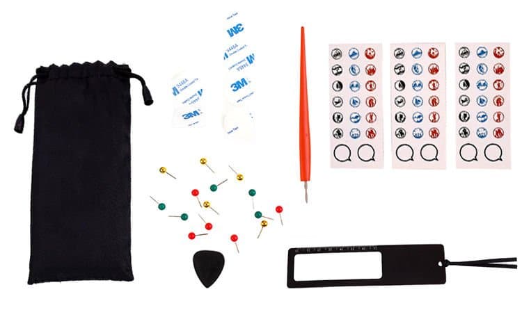 - karcoló kocka, tűk, vonalzó mini nagyítóval, matrica személyre szabása, karcoló, tisztítókefe, szerelőszalag, táska a tartozékok tárolására)