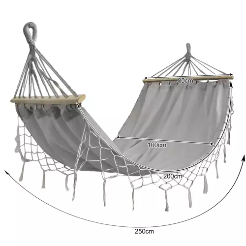 A függőágy természetes, magas minőségű anyagokból készült. A pamut és a kis mennyiségű poliészter keveréke nemcsak kellemes tapintású, hanem tartós is. A megfelelő szellőzésnek köszönhetően még a forró napokon is kényelmesen használható.