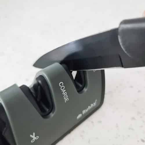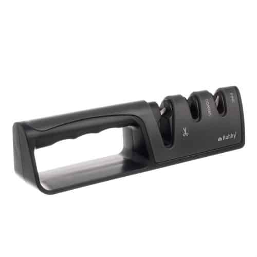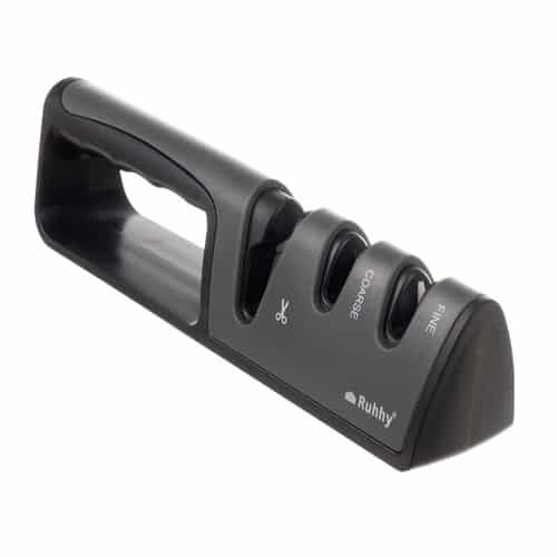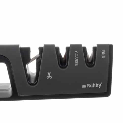 KÉTFÁZISÚ KÉSÉLEZÉS ÉS EGY FÁZIS OLLÓÉLEZÉSHEZ – az élező 3 lyukkal van ellátva, az első az olló élezésére szolgál, a következő kettő pedig a kések kétfázisú élezésére.