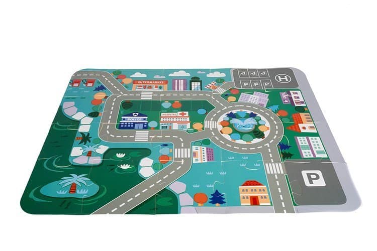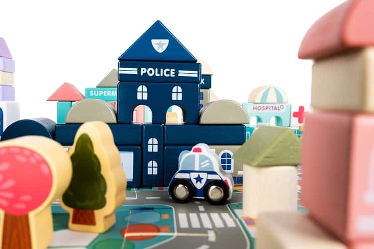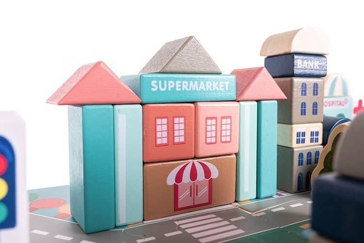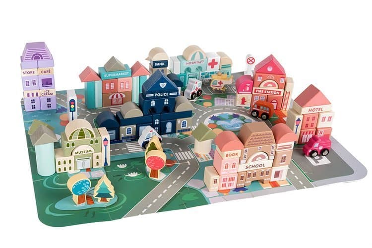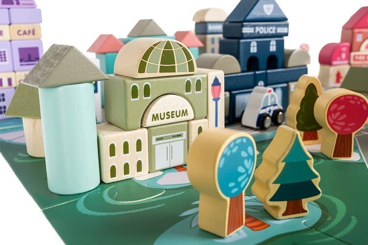A városépítő játék sok órányi szórakozást biztosít a legkisebbeknek. A készlet nagyon nagy: rengeteg különböző típusú építőkockát és utcát imitáló elemet, egy tárolótasakot és egy vödröt tartalmaz. A tömbök különféle típusú lakóépületek és középületek építésére használhatók, ezen kívül olyan elemeket is tartalmaz, mint a fa járművek, épületek, fák és emberek.