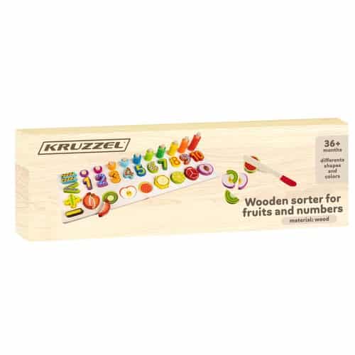 - a készlet tartalma: 10 db szám, 8 db gyümölcs (mágnessel összekötött fél), fa kés, jelek: =, <, +, -, 55 színes kör