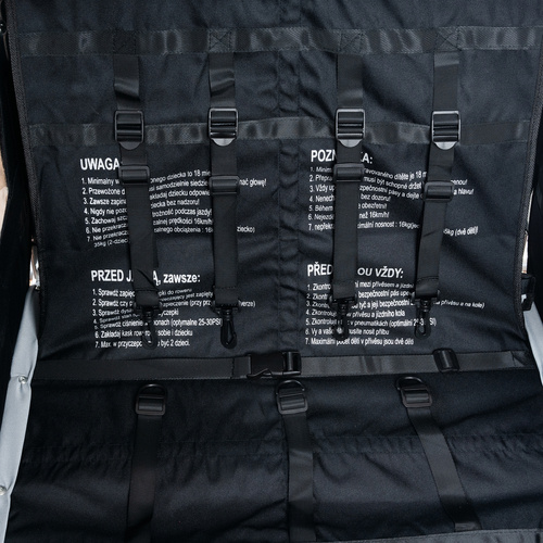 Masszív acélvázzal készült, rendelkezik rögzítőfékkel, fényvisszaverő elemekkel és egy jól látható biztonsági zászlóval. Az integrált biztonsági övek gondoskodnak róla, hogy gyermekeid mindig biztonságban legyenek.