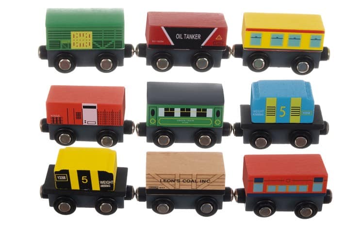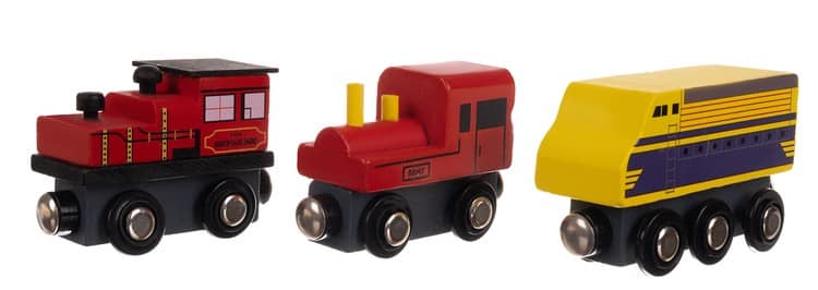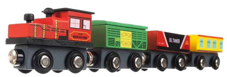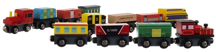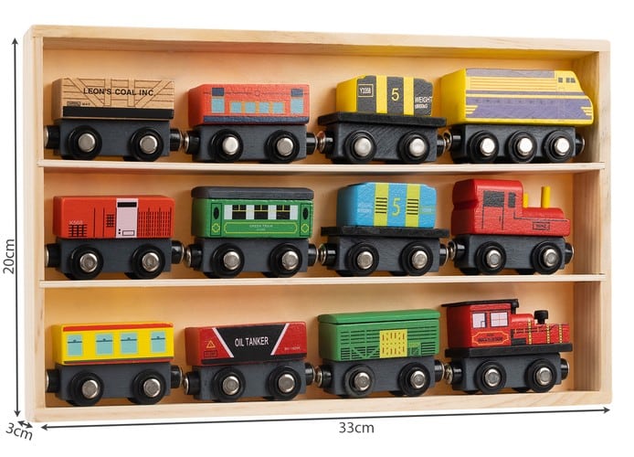 A készlet sok elemet tartalmaz – 3 mozdonyból és 9 különböző színű kocsiból áll, melyek rendkívül precízen és szépen kidolgozva készültek.
