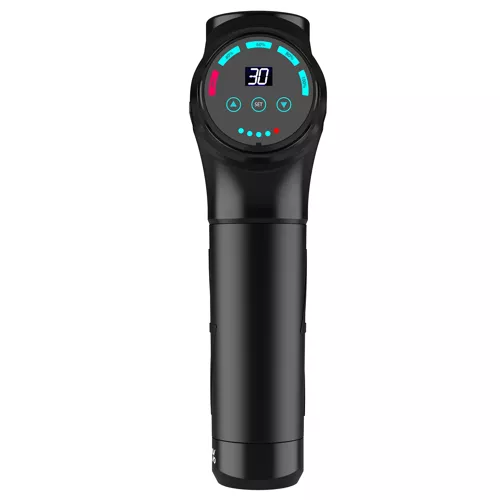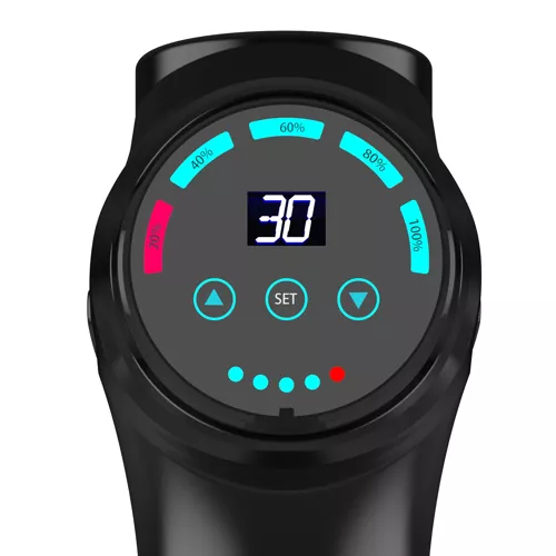 AKÁR 30 FOKOS INTENZITÁS – a masszázspisztoly akár 30 masszázserősségi szinttel rendelkezik! Ez nagyon nagy tartomány, amely lehetővé teszi az egyéni sebesség beállítását az izmokhoz, amelyekben alkalmazni kívánjuk. A pisztoly egyértelmű kijelzővel rendelkezik, amely mutatja az adott szintet, így állandó ellenőrzést biztosít. A munka intenzitása érzékeny érintőpanel segítségével változtatható, csak érintsd meg könnyedén – nem kell kényszerítened a módbeli váltást.