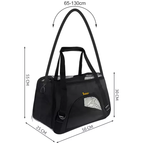 Egy ovális kisállat hordtáska, fekete színben, biztonsági cipzárral, fogantyúval rendelkezik, amely könnyen szállítható, és megfelelő szellőzéssel és hűvös kialakítással rendelkezik. Elől könnyedén zipzárral zárható, nyitható, leszerelhető illetve vállpánt is csatlakoztatható rá. Fekete színével divatos megjelenésű, emellett erős és tartós, könnyen tisztítható anyagból készült.