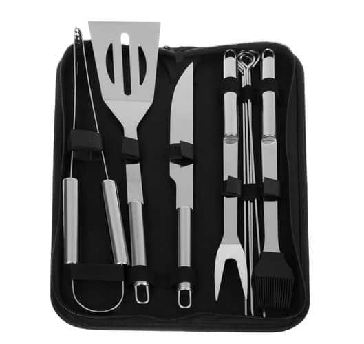 a készlet tartalmazza: kés, villa, spatula, ecset, fogó, 4 nyárs, tok;