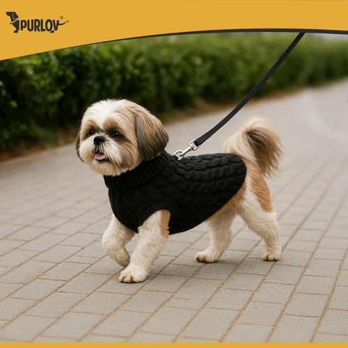 Ez a Purlov fekete pulóver tökéletes választás minden kis- és közepes méretű kutya, valamint nagyobb macska számára, aki melegen, kényelmesen és stílusosan szeretne sétálni a hideg hónapokban.