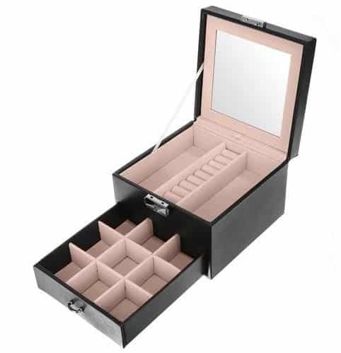 Ez a praktikus kis tartó remek lehetőséget nyújt arra hogy egyszerűen rendet tartsunk ékszereink között és mindig megtaláljuk a reggeli rohanásban azt a nyakláncot vagy gyűrűt amit éppen keresünk. Fekete színű ökobőrrel van borítva, így kifejezetten dekoratív és hangulatos kiegészítője lesz a fürdőszobának vagy a gardróbnak. Praktikus, több rekesszel és tükörrel rendelkezik. Bőröndbe kiválóan pakolható, garantálja hogy az ékszerek nem fognak sem elveszni sem megrongálódni egy utazás alatt. Az ékszerdoboz a következőkből áll: az első egy kihúzható fiók 9 kis rekesszel, amely lehetővé teszi például kis fülbevalók elhelyezését. A második szinten egy hosszú sor rekesz található görgőkkel a gyűrűk számára, és két nagy rekesz az oldalán a többi ékszer számára, mint például láncok, karkötők, medálok, órák és még sok más. A rekeszek puha anyaggal vannak bélelve, hogy megóvják a finom ékszereket a karcolásoktól. Az ékszerdoboz belsejében egy dönthető tükör található. Tökéletes ékszerek felhelyezésére, de sminkeléshez is.